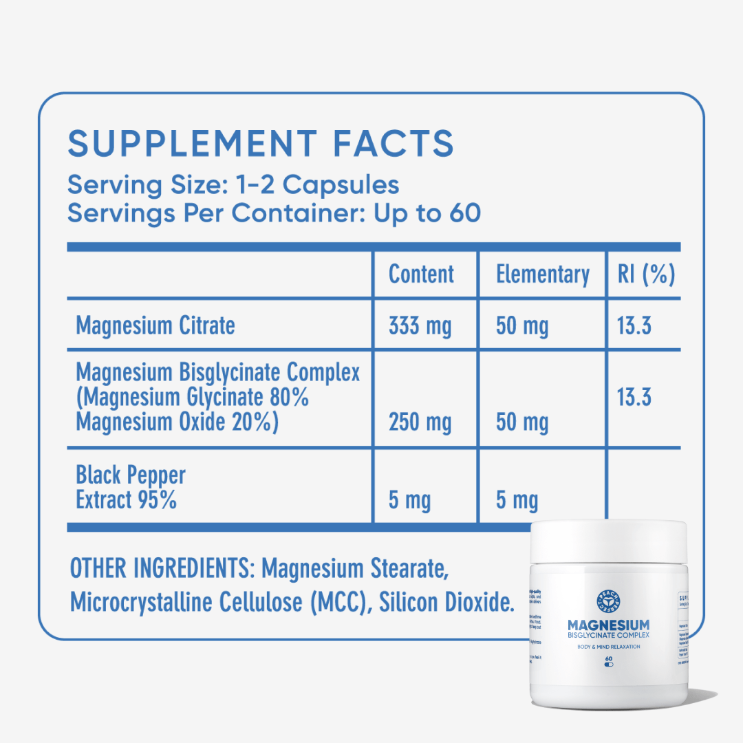 : magnezijum-citrat, magnezijum bisglicinat kompleks (magnezijum-bisglicinat, magnezijum-oksid), zgušnjivač:  hidroksipropil metilceluloza, sredstvo za povećanje zapremine: mikrokristalna celuloza, BioPerine®-ekstrakt ploda crnog bibera (Piper nigrum) sa 95% piperina, sredstva protiv zgrudvavanja: magnezijum-stearat, silicijum-dioksid