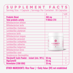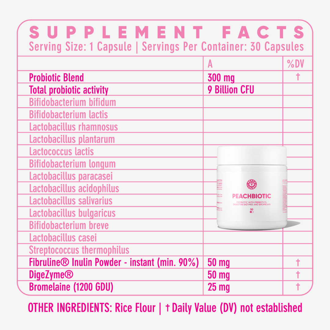 Peachbiotic: Mešavina korisnih bakterija (Bifidobacterium bifidum, Bifidobacterium lactis, Lactobacillus rhamnosus, Lactobacillus plantarum, Lactococcus lactis,  Bifidobacterium longum, Lactobacillus paracasei, Lactobacillus acidophilus, Lactobacillus salivarius, Lactobacillus bulgaricus, Bifidobacterium breve, Lactobacillus casei, Streptococcus thermophilus), pirinčano brašno, omotač kapsule (zgušnjivač: hidroksipropil metilceluloza), inulin (Fibruline®), DigeZyme® (α-amilaza, proteza, lipaza, celulaza, laktaza, bromelain (1200 GDU/g)